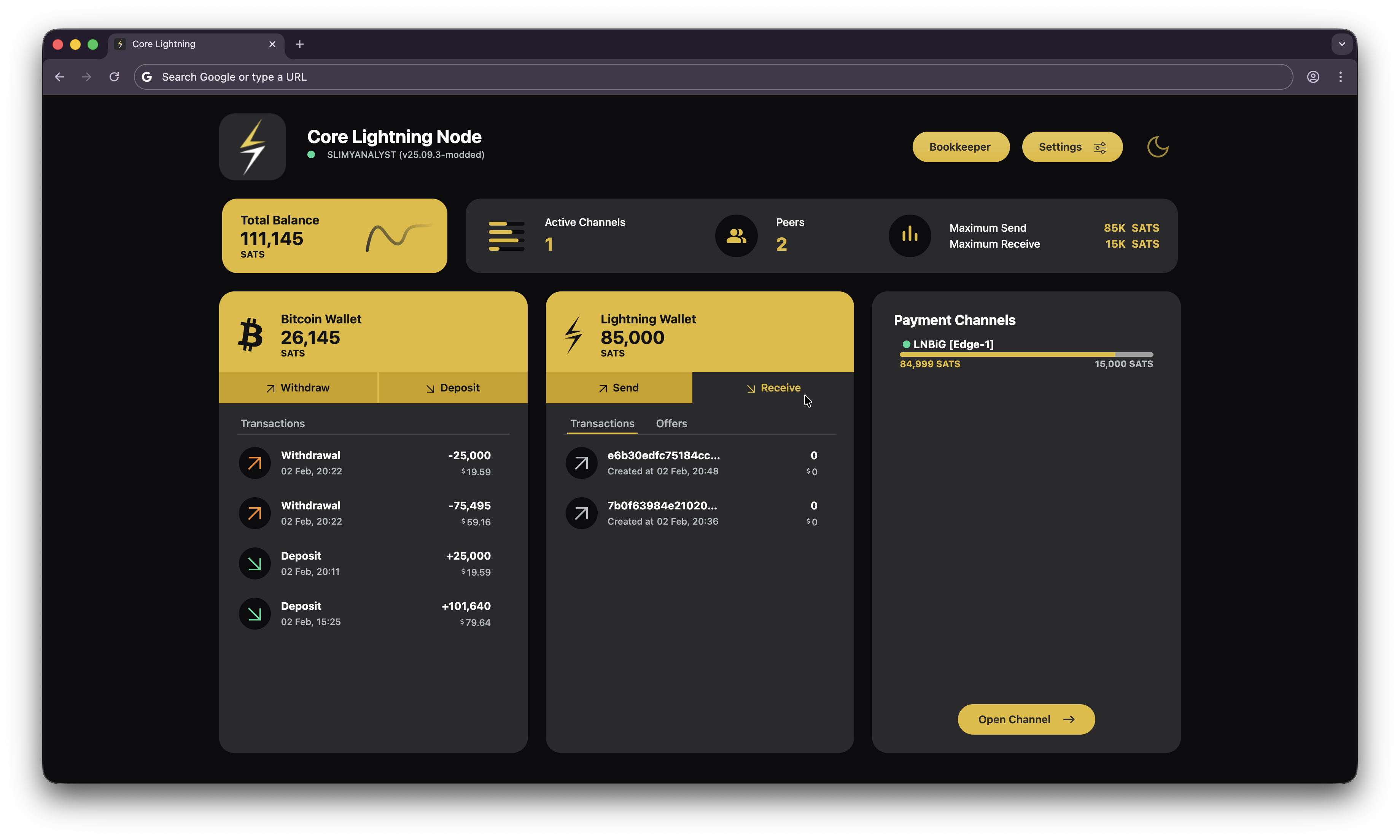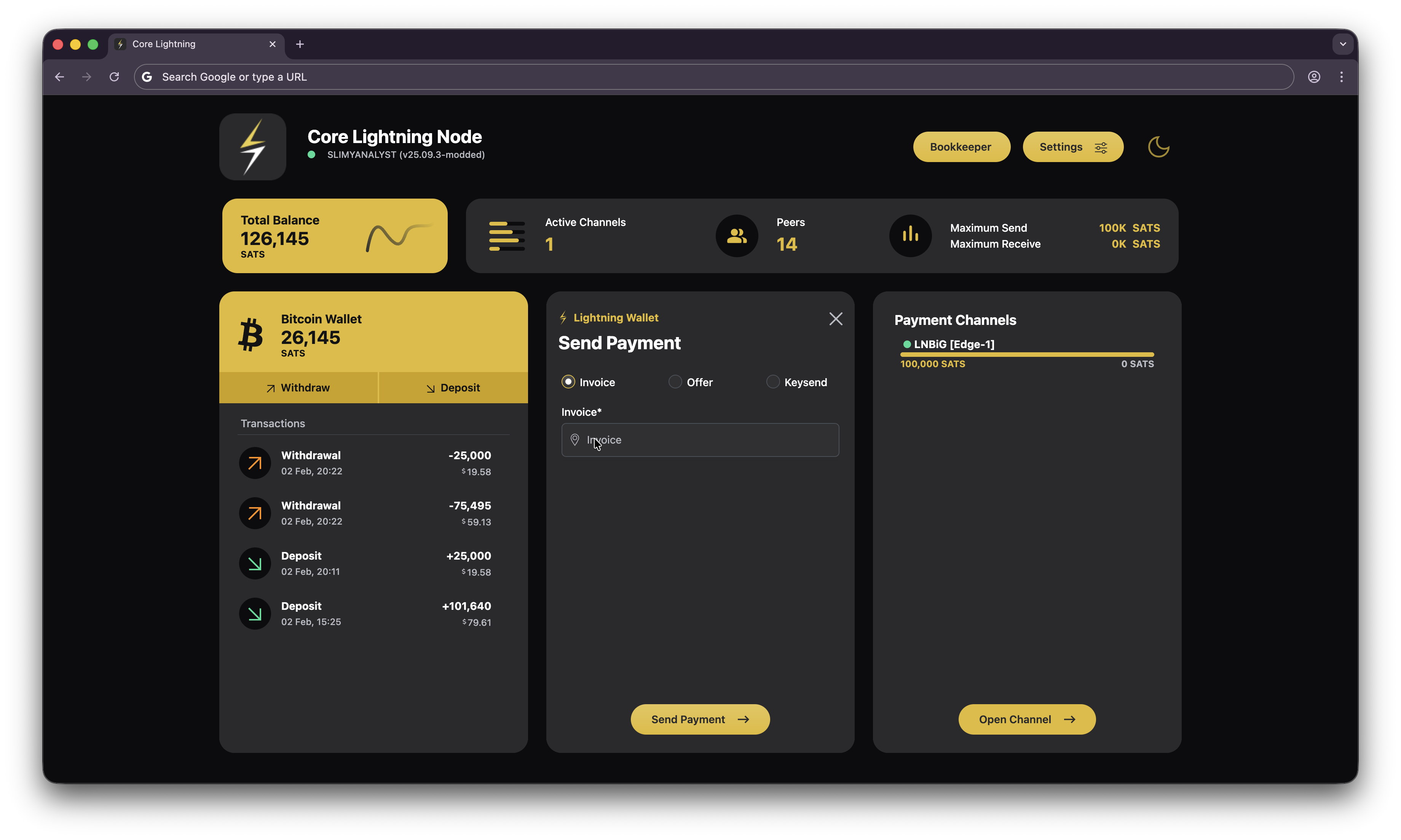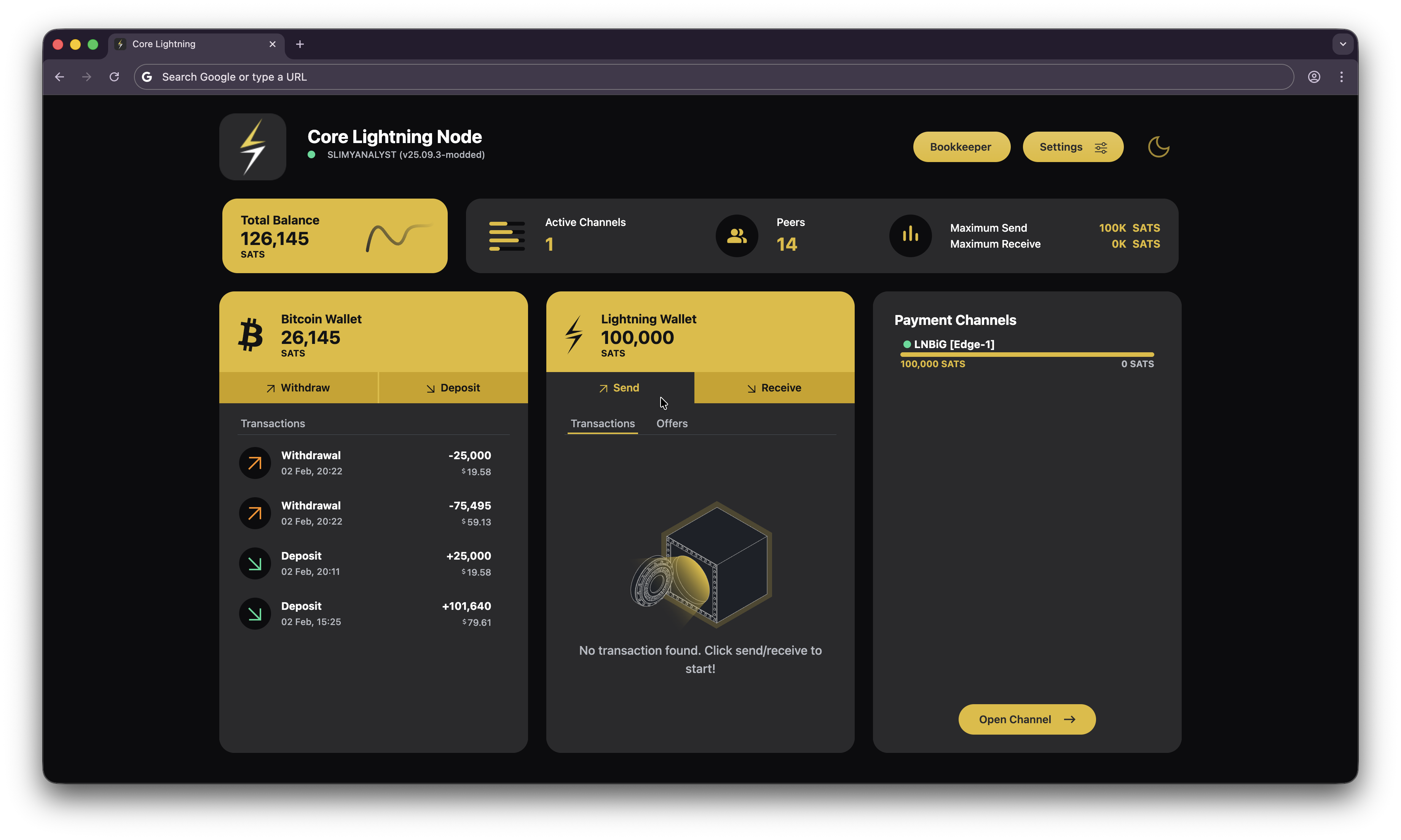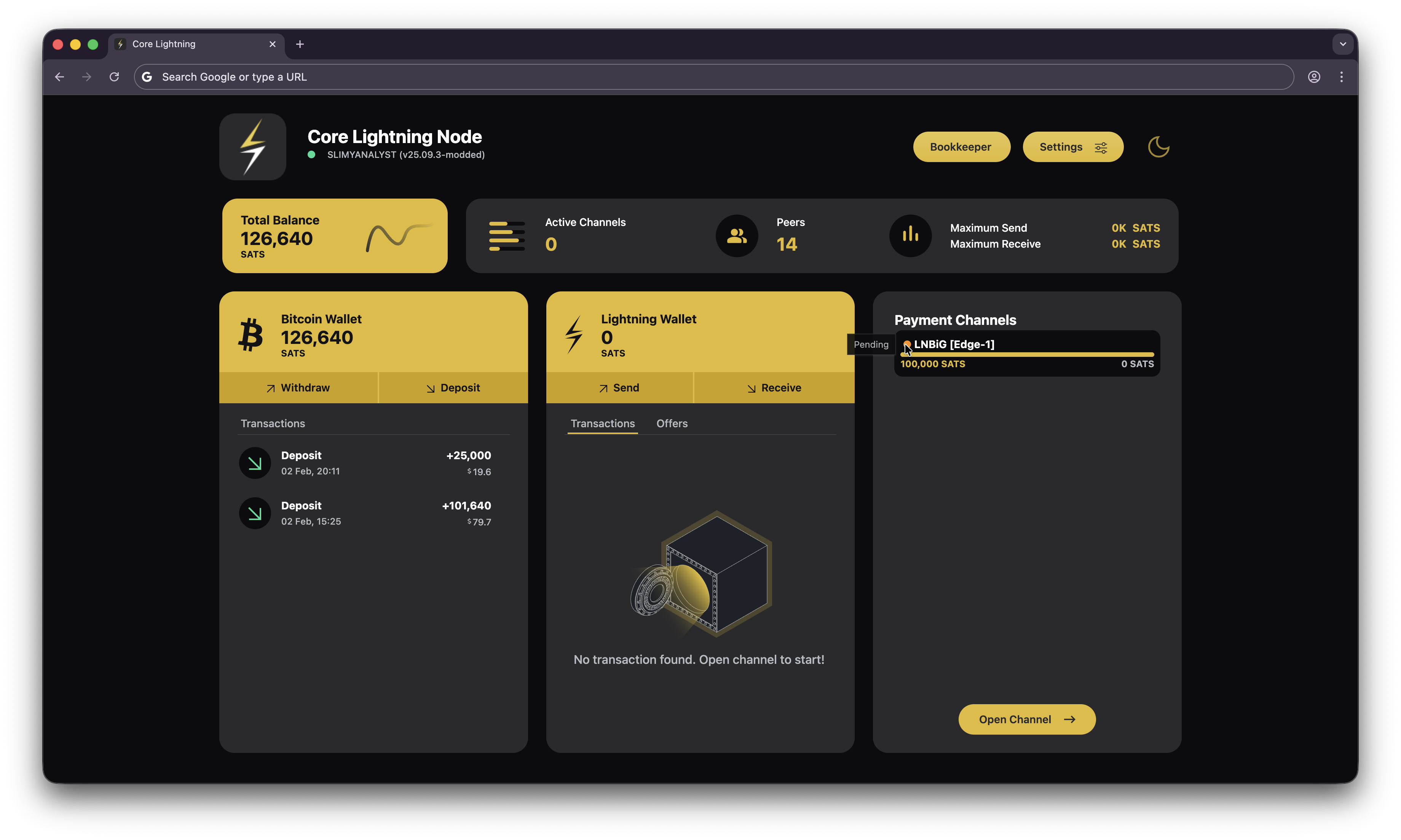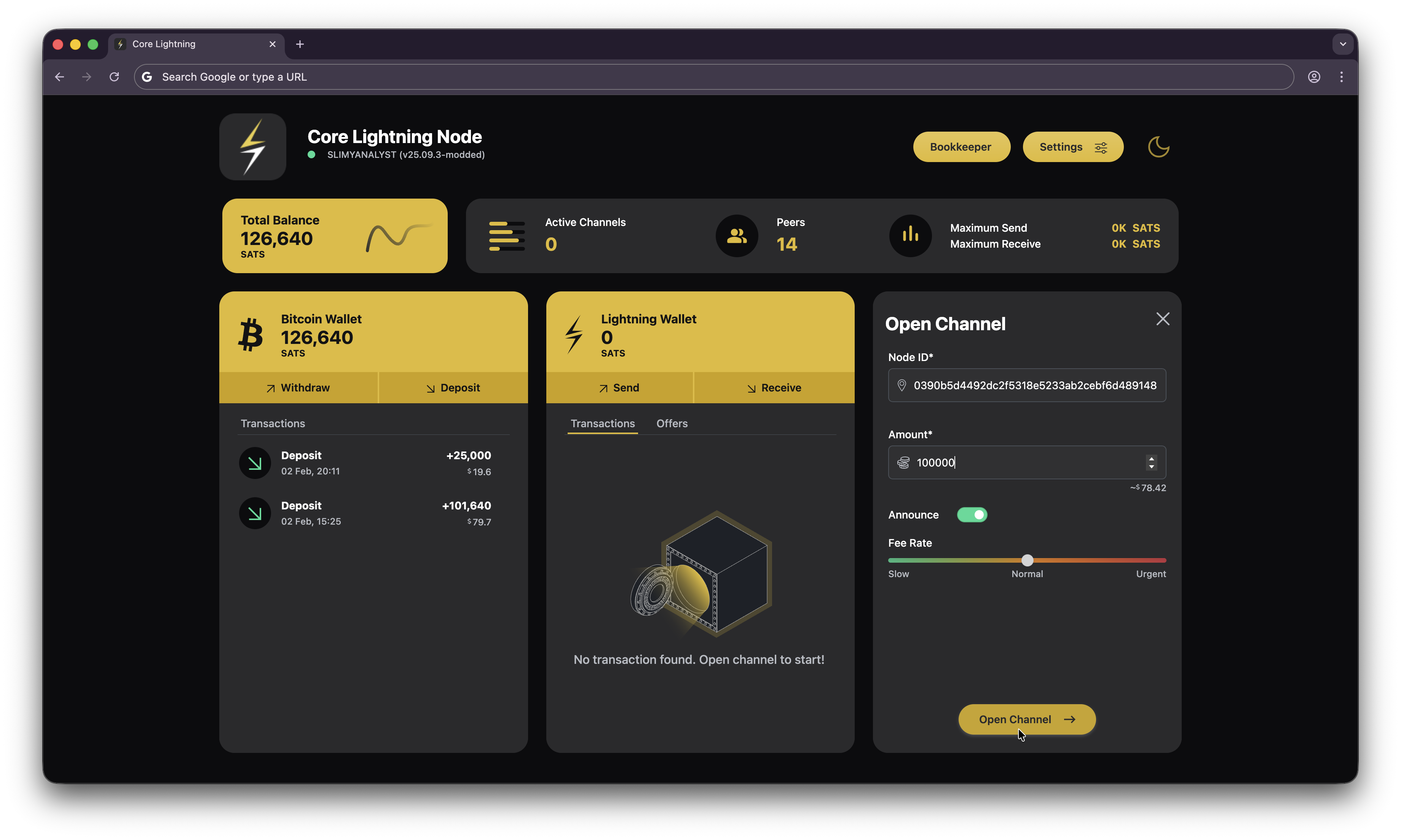 - Deposit at least 130000 sats of onchain BTC into your Core Lightning wallet on Umbrel. Allocate 100000 sats to